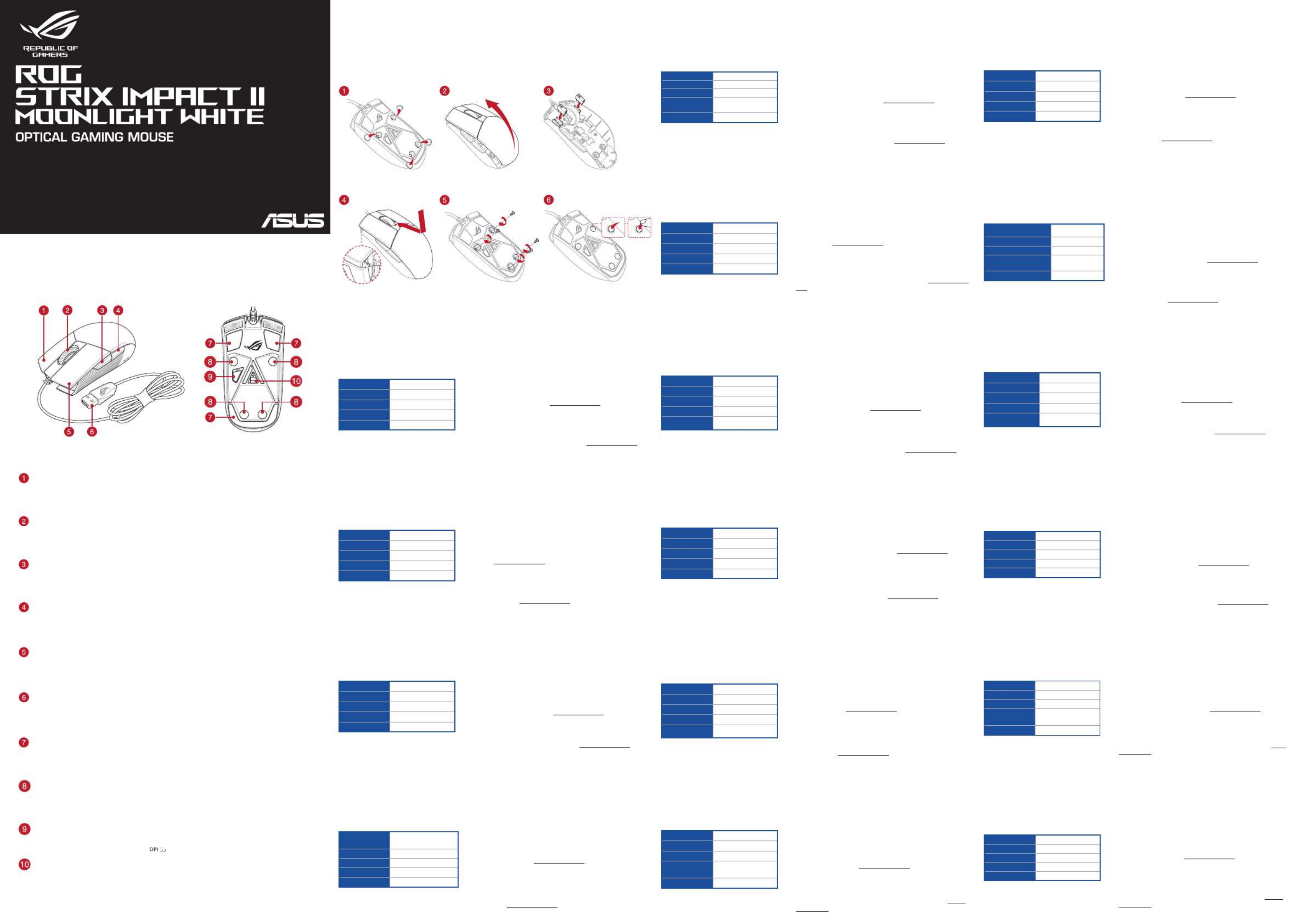 Oto Asus ROG Strix Impact II Moonlight White (mysz) instrukcja użytkownika. 2 strony w języku Angielski o wadze 0.8 Mb. Jeśli nie możesz znaleźć odpowiedzi na swoje pytanie Zapytaj naszą społeczność.