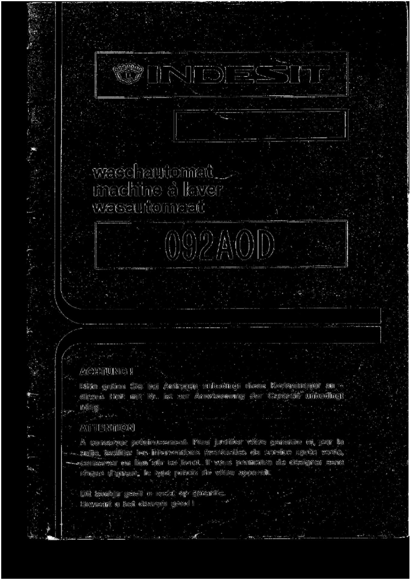 Oto Indesit 092 AOD (pralka) instrukcja użytkownika. 6 strony w języku - o wadze 0.4 Mb. Jeśli nie możesz znaleźć odpowiedzi na swoje pytanie Zapytaj naszą społeczność.