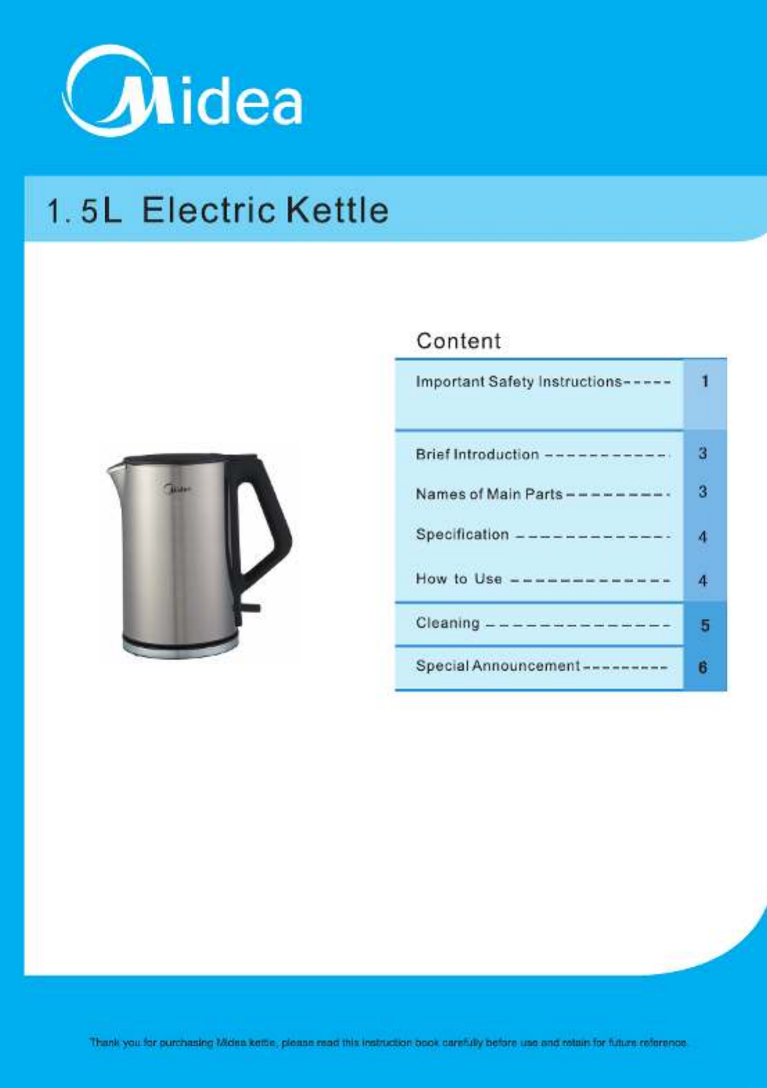 Oto Midea MKE170M2ADK (czajnik) instrukcja użytkownika. 12 strony w języku Angielski o wadze 1.0 Mb. Jeśli nie możesz znaleźć odpowiedzi na swoje pytanie Zapytaj naszą społeczność.