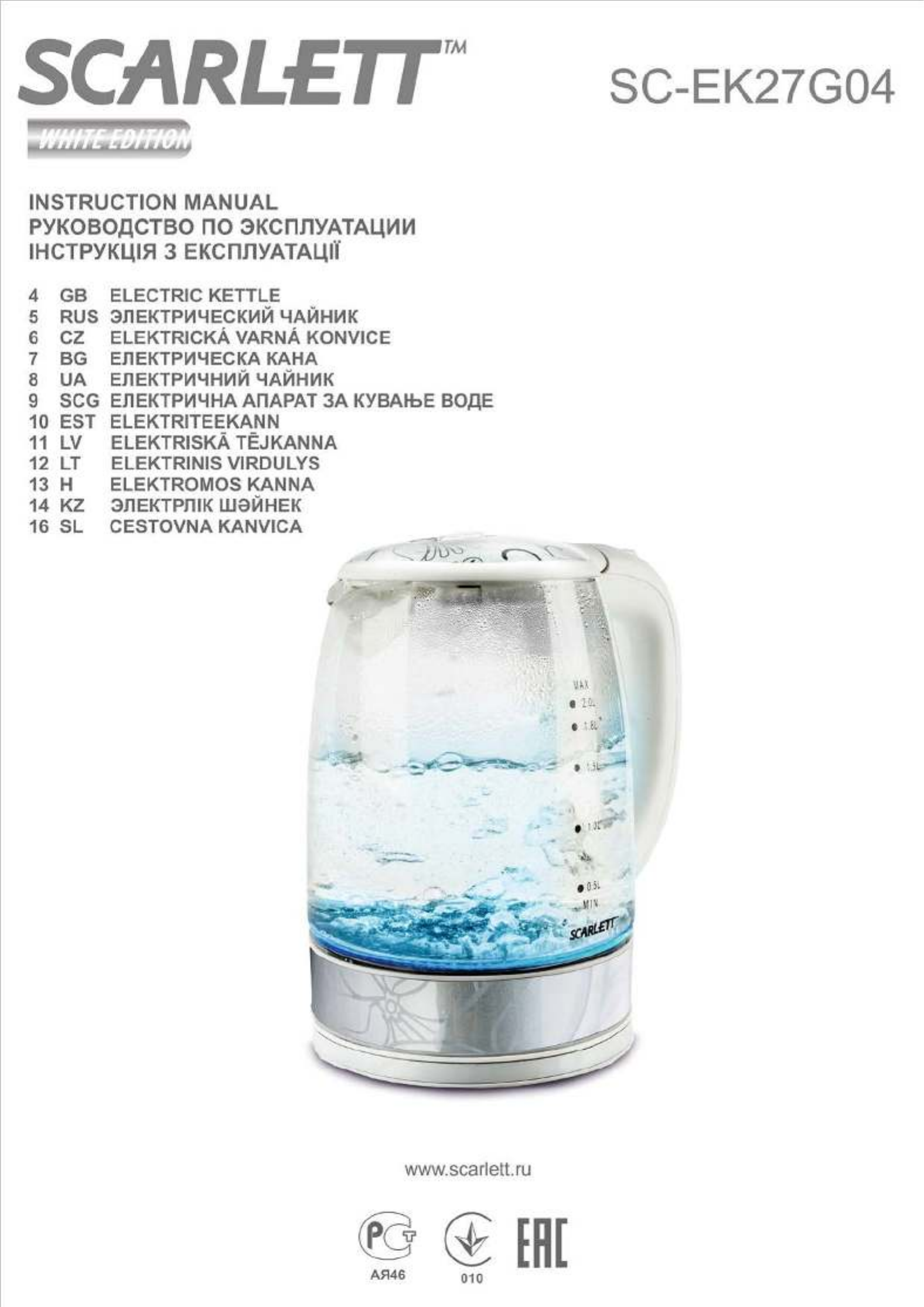 Oto Scarlett SC-EK27G04 (czajnik) instrukcja użytkownika. 16 strony w języku Angielski o wadze 1.1 Mb. Jeśli nie możesz znaleźć odpowiedzi na swoje pytanie Zapytaj naszą społeczność.
