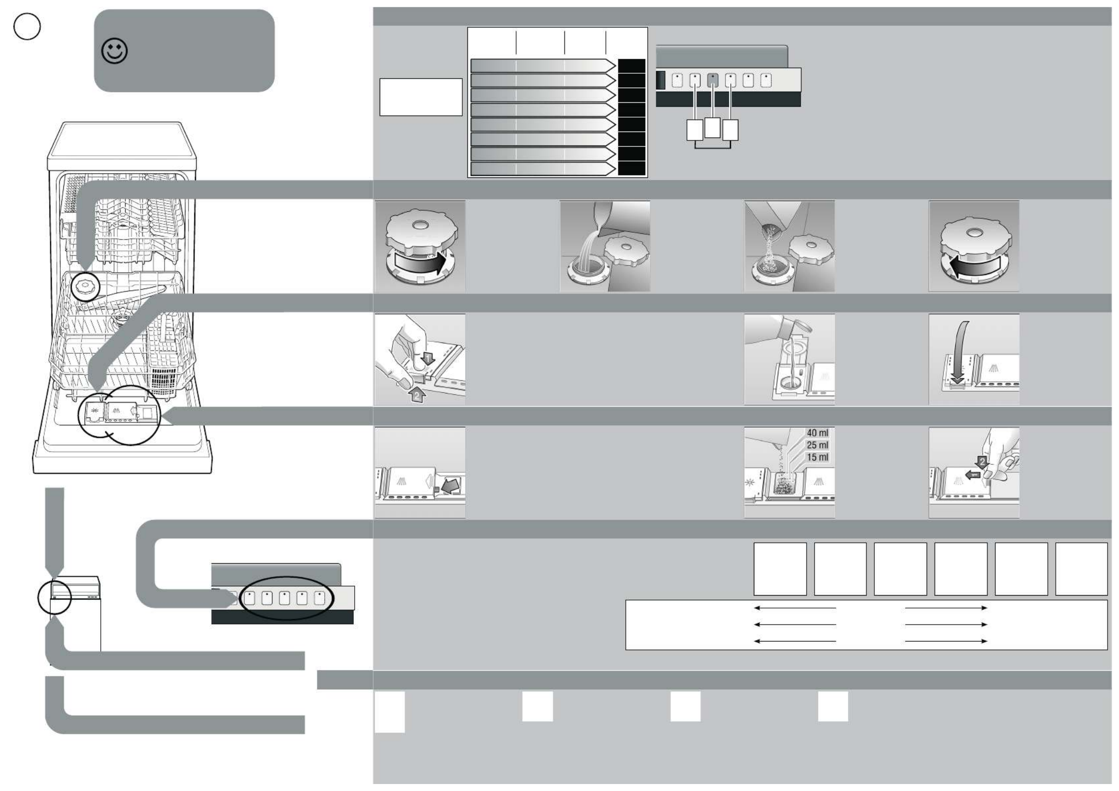 | Programy mycia: | Auto 55-65°C, Eco, Intensive, Quick |